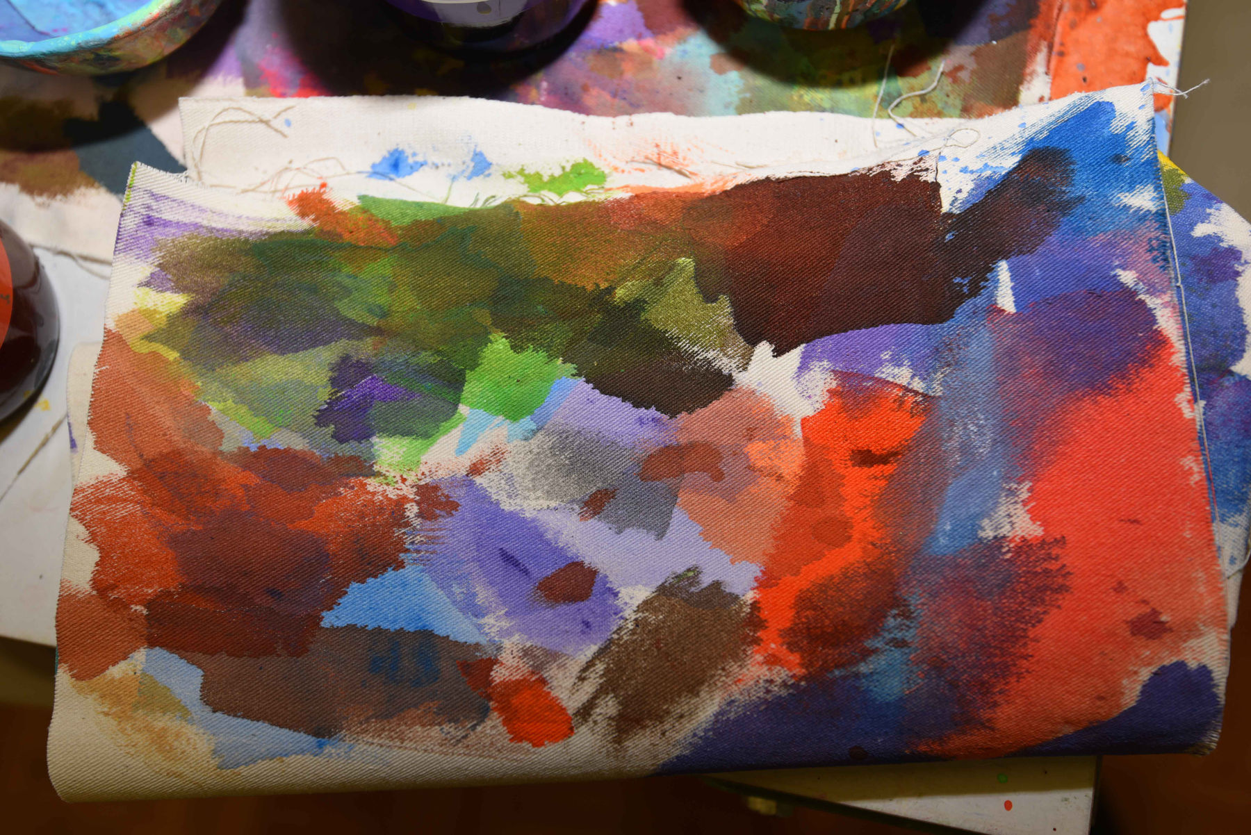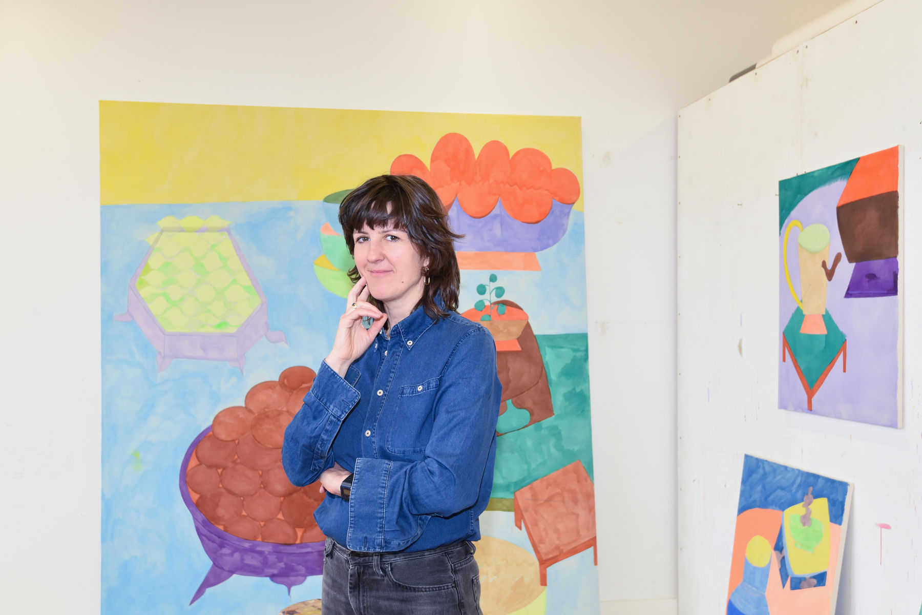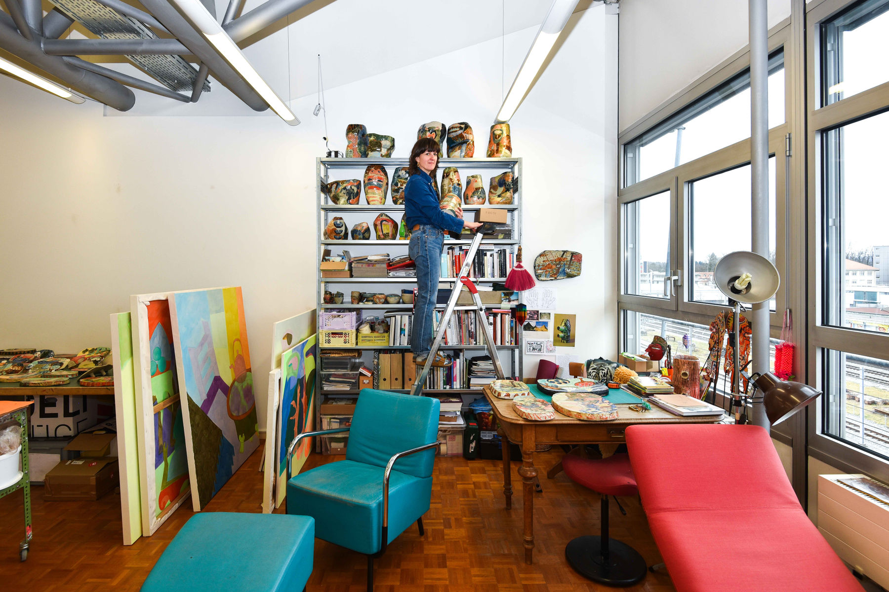 The studio functions as a site of research rather than mere production. Works in progress are arranged in constellations that foreground relational thinking across media. Canvases alongside glazed and unglazed ceramic surfaces articulate an approach in which material conditions actively inform compositional decisions. Gassmann's process is guided by intuition, yet remains critically attentive to formal balance, spatial organization, and chromatic precision.