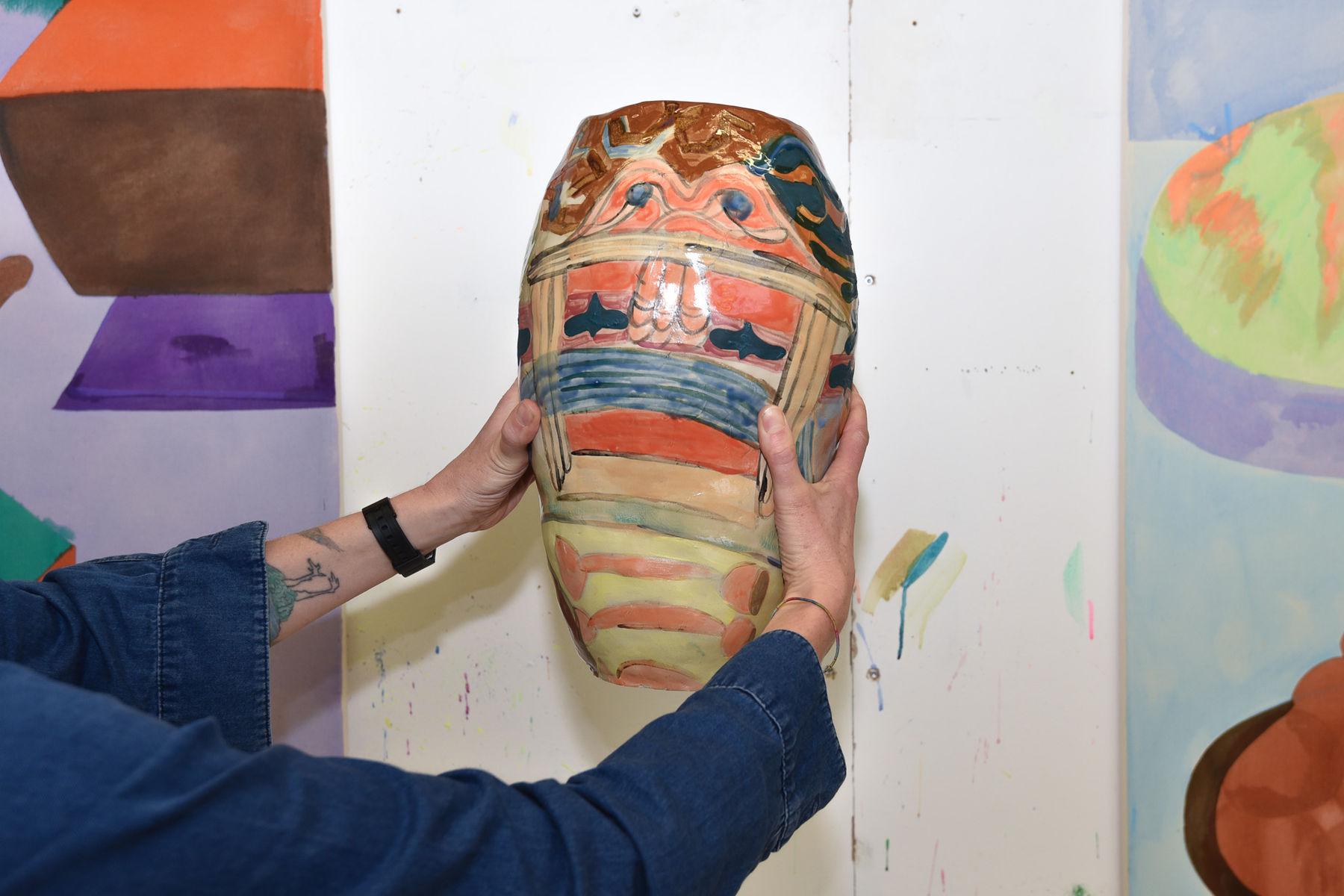 Animals entered the work differently. I have always loved drawing birds, perhaps influenced by my father, who admires them deeply. Many animals and hybrid beings appeared when I learned tattooing. I wanted to develop my own subjects, protective creatures. During that period I drew and tattooed numerous animals and hybrid forms and translated them onto canvas and ceramic. The shapes act as containers that are filled by chromatic constellations with new narratives while resisting direct storytelling.